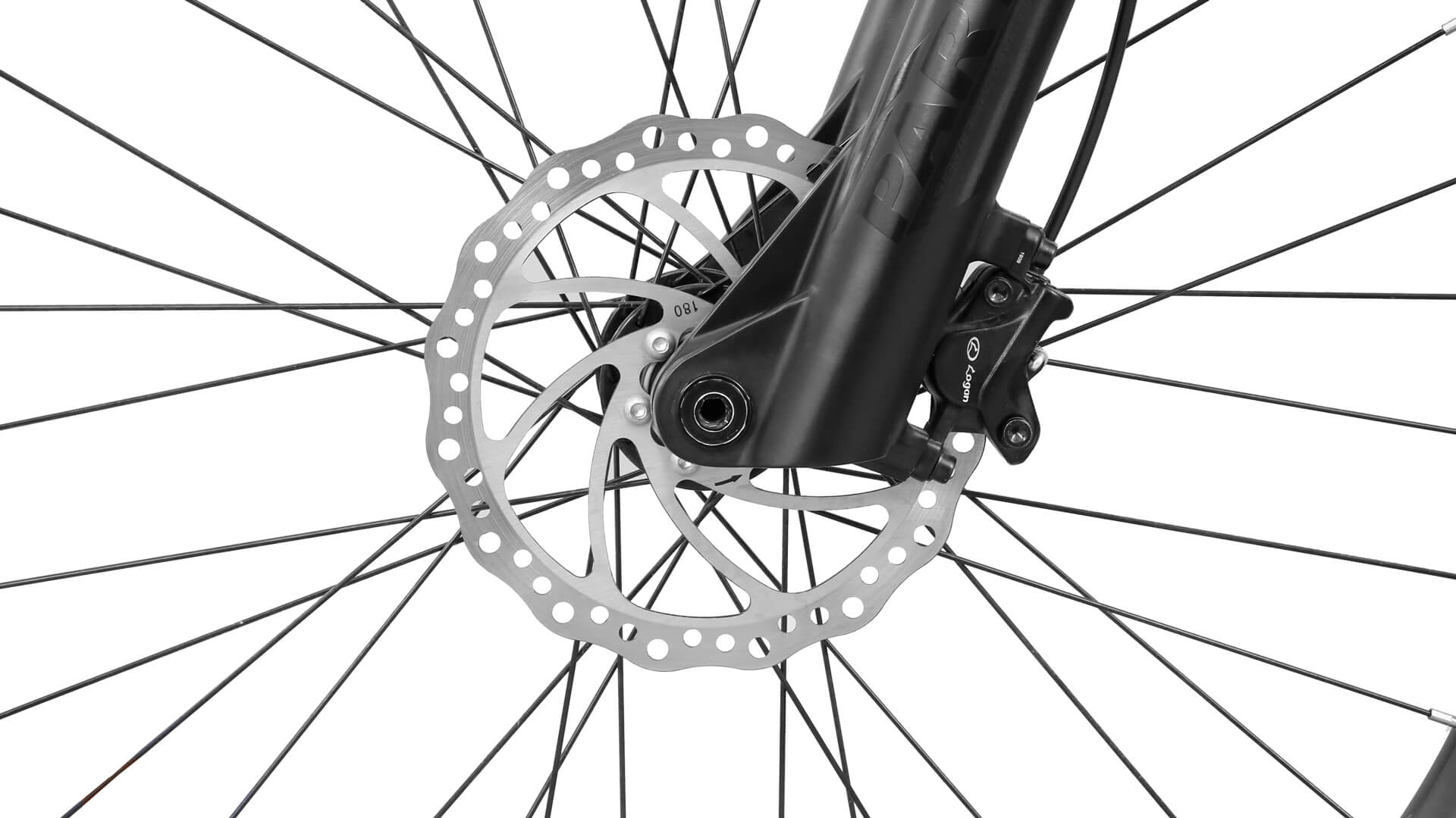 - Hydraulic suspension alloy fork, adjustable; 120MM travel distance.
