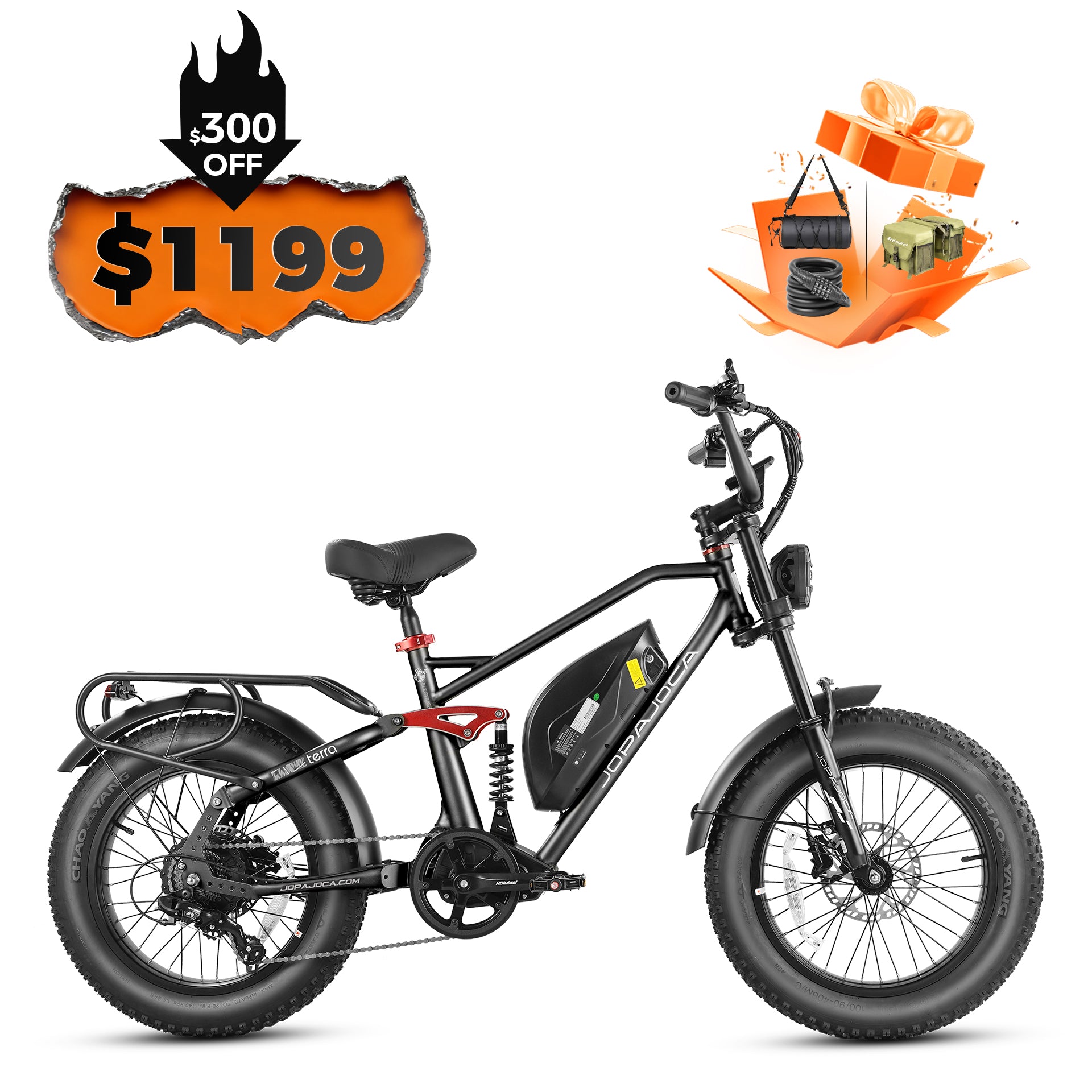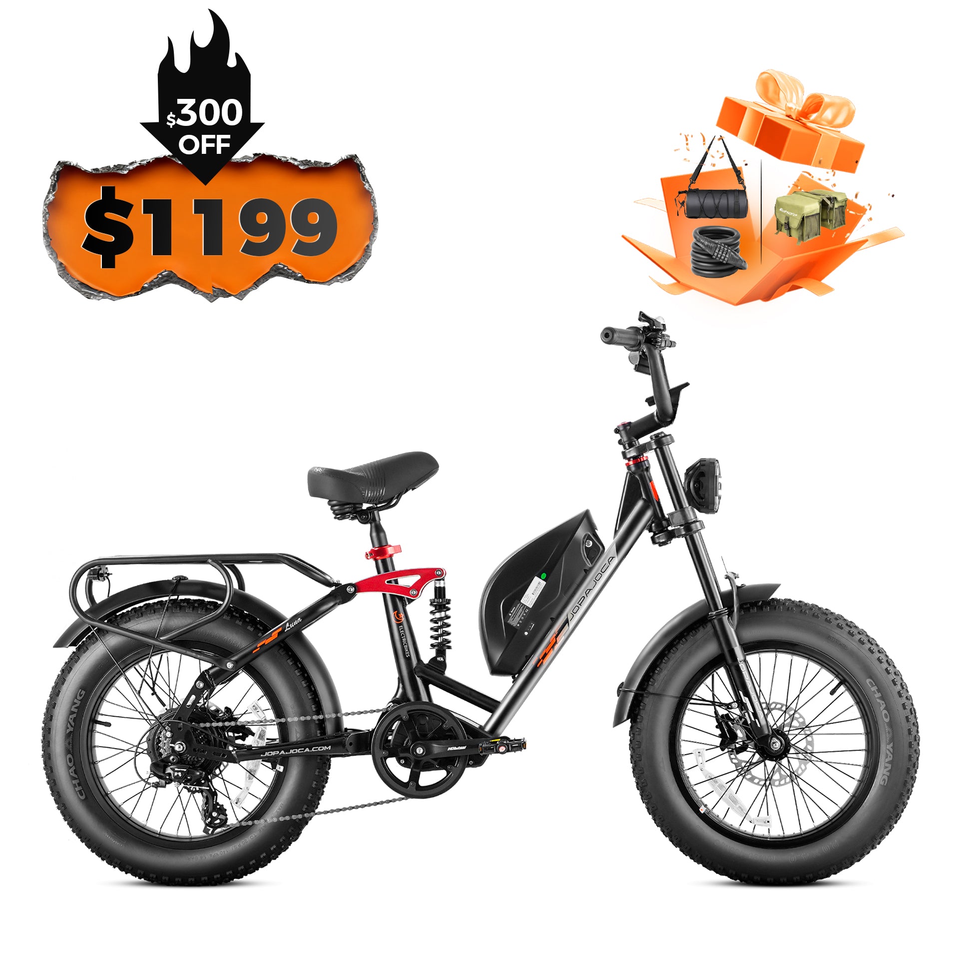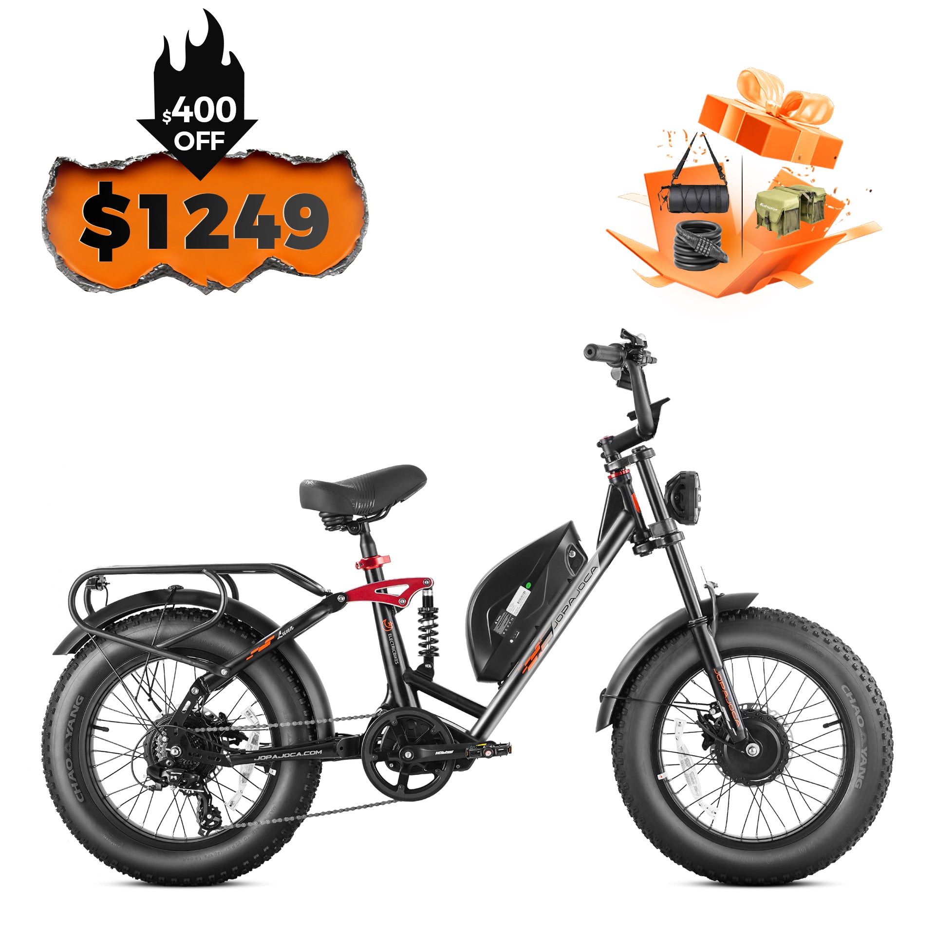 - 20" * 4.0" tires; tire pressure marked on sidewall.